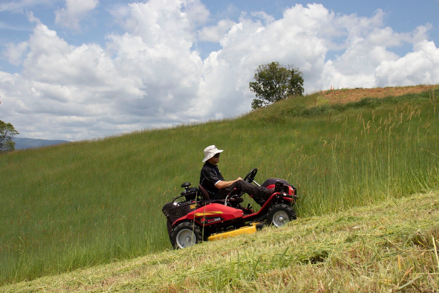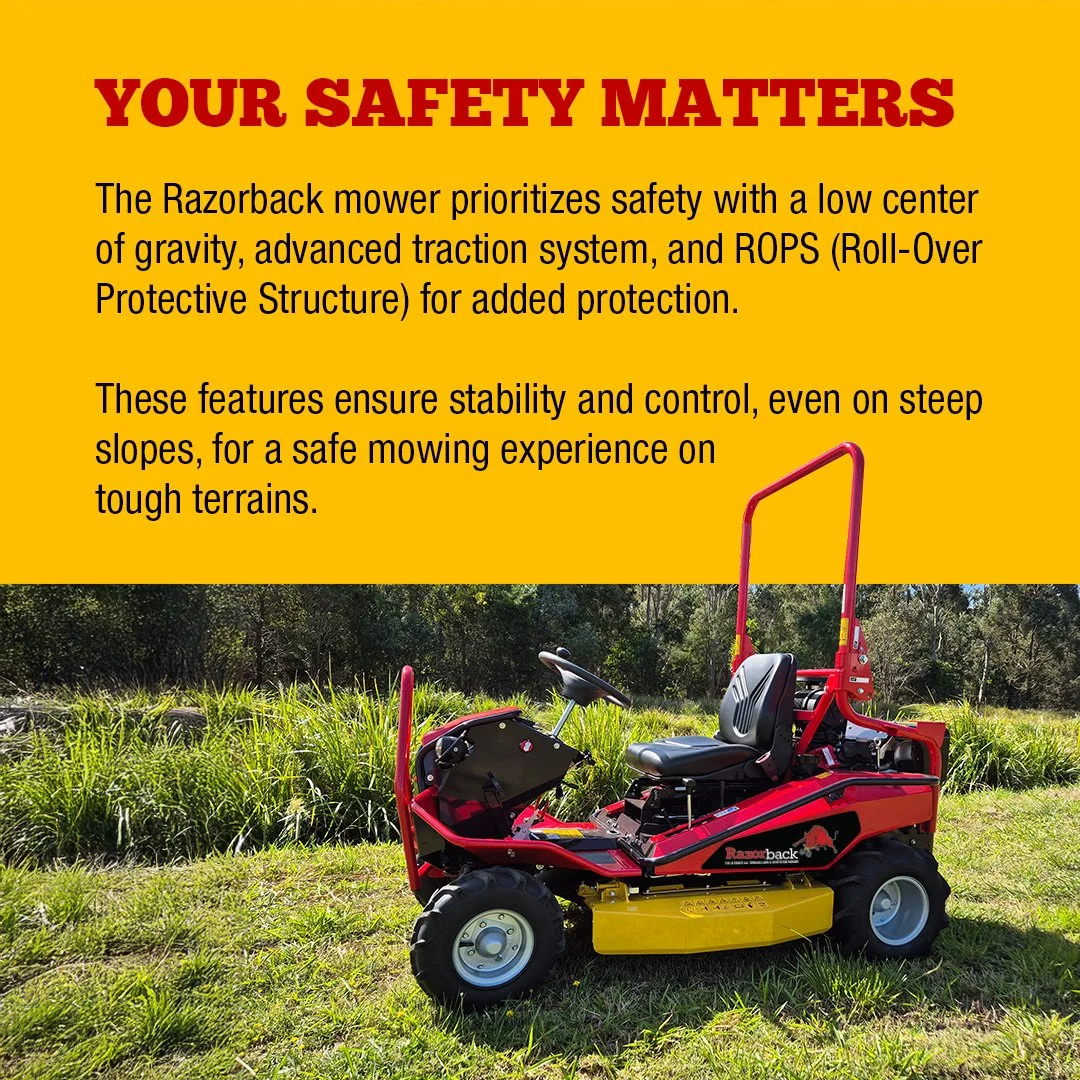 The Razorback is much safer than standard ride on lawnmowers as it’s centre of gravity is so low that it can safely operate on slopes up to 25 degrees. Normally standard lawnmowers can only operate on slopes up to 15 degrees. Find out more about the Razorback capabilities.